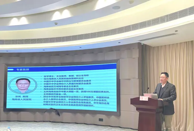 ↑海南省人民医院张帆教授在致辞中指出,神经介入手术的临床管理是提升脑血管病诊疗质量的关键环节,此次会议聚焦真实病例复盘研讨,为省内同行提供了难得的经验交流机会,对推动全省神经介入技术同质化发展具有重要意义。