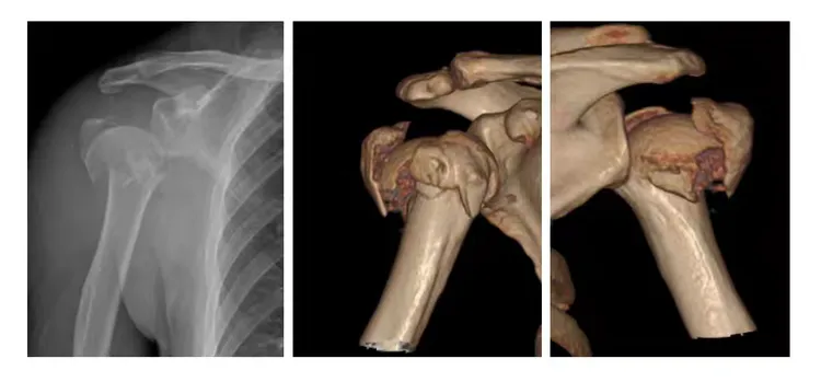 ↑术前患者右肩影像学资料:左图(右肩正位片)中图(右肩CT骨三维重建前面观)右图(右肩CT骨三维重建后面观)