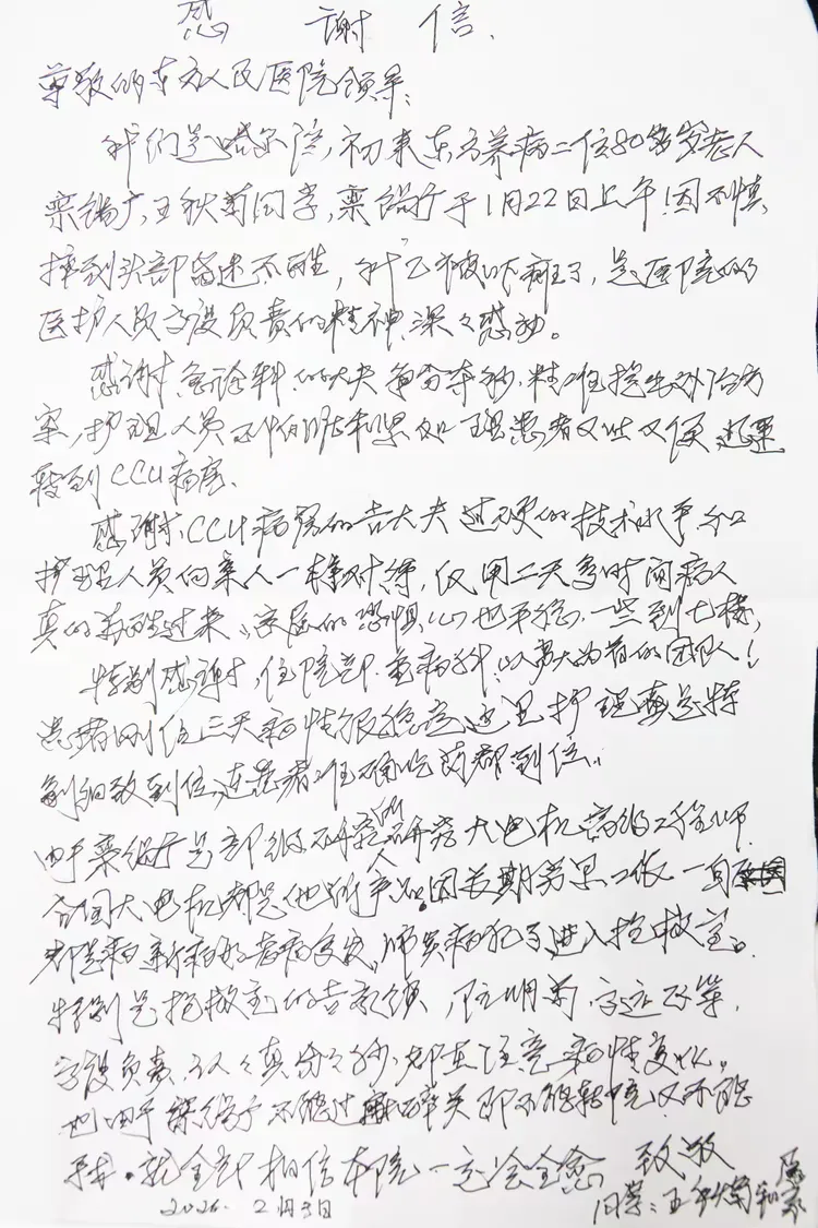 这封手书感谢信,纸短情长,既是两位耄耋老者对生命守护的由衷感恩,更是对东方市人民医院医者精神的生动注解。从急诊一线的快速响应与精准处置,到多学科会诊的审慎研判与风险共担,再到CCU与神经外科的无缝衔接与精细化照护,整个救治链条中,各科室团队以患者为核心,用专业素养化解危局,用人文温度慰藉心灵,将“敬佑生命”的誓言融入每一个诊疗细节。这份跨越科室的协作之力、沉淀于日常的医德之光,不仅让异乡患者感受到了跨越千里的温暖,更彰显了医院在医疗质量与人文服务上的双重坚守。