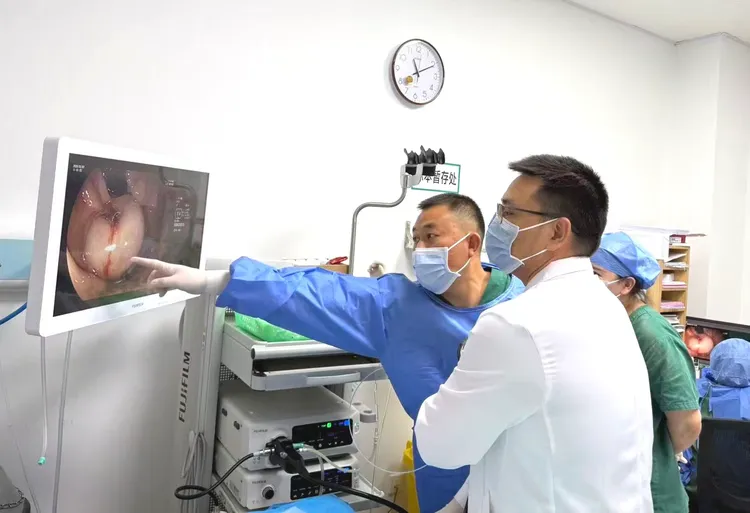 牟海军教授与我院消化内科团队经过充分研讨,结合患者实际病情,最终确定采用尼龙绳圈套断流联合硬化剂+组织胶注射的创新微创治疗方案,实现精准止血与安全断流。手术中,牟海军教授凭借精湛的内镜操作技术,先通过内镜将尼龙绳精准套扎于胃底曲张静脉根部,以“荷包缝合”式完成断流,彻底阻断静脉瘤血供,随后在尼龙绳的保护下,对曲张静脉部位进行多点精准注射,利用硬化剂闭塞血管、组织胶快速凝固封堵破口,在双重作用下彻底消除曲张静脉出血隐患。