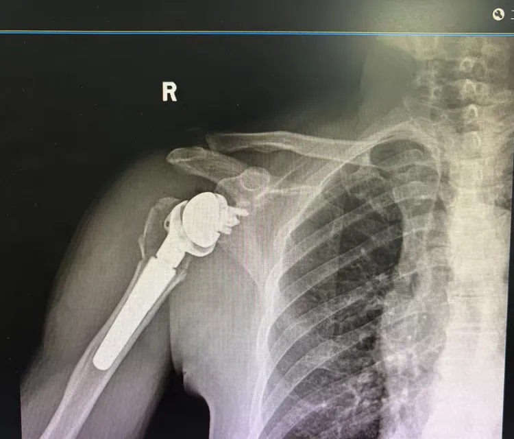 为保障手术安全与疗效,我院第一时间邀请海医二院王勇平教授主刀。术前,专家团队多轮联合会诊,精细研判病情,从假体型号精准选择、截骨精度毫米级把控,到软组织平衡修复、骨折复位矫正,为每个关键环节制定周密且针对性的手术方案;手术中,在麻醉科全程护航下,团队默契协作,90分钟顺利完成手术,假体植入位置与关节平衡效果均达临床理想标准,术中出血少、视野清晰,成功矫正肱骨头翻转畸形并完成关节重建。